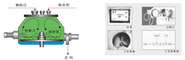粉體物料與粘合劑在圓筒形容器中由底部混合漿充分混合成濕潤材料,然后由側(cè)置的高速粉碎槳切割成均勻的濕顆粒。制粒時間短。主藥與輔料差異大時,仍能達(dá)到均勻結(jié)合,無分層現(xiàn)象。
