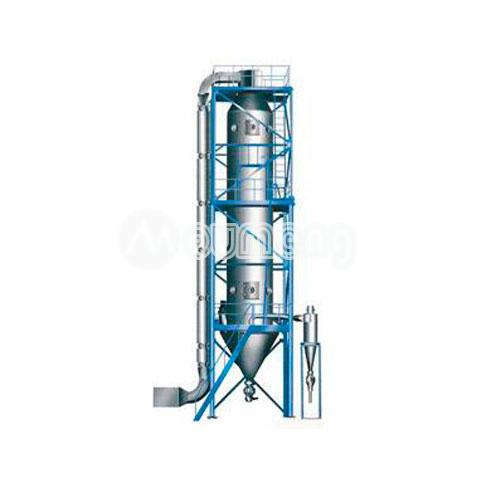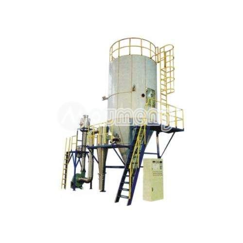 壓力噴霧干燥機是一種可以同時完成干燥和造粒的裝置。按工藝要求可以調節(jié)料液泵的壓力,流量,噴孔的大小,得到所需的按一定大小比例的球形顆粒。其工作過程為料液通過隔膜泵高壓輸入,噴出霧狀液滴,然后同熱空氣并流下降,大部分粉粒由塔底排料口收集,廢氣及其微小粉末經旋風分離器分離,廢氣由抽風機排出,粉末由設在旋風分離器下端的授粉筒收集,風機出口處還可裝備二級除塵裝置,回收率在96-98%以上。其與物料接觸部分的塔體、管道、分離器的材料,均采用SUS304制作。在塔體內部與外殼之間有足夠的保溫層,填充材料為超細玻璃棉,塔體設有觀察門、視鏡、光源及控制儀表,由電氣控制操作臺控制和顯示。其熱源裝置采用蒸汽加熱或電加熱器,具有操作方便、啟動快、結構緊湊、熱風干凈清潔等優(yōu)點。另外在電氣控制柜內裝有電加熱器的控制調節(jié)裝置,使進口溫度無級調節(jié)。對于缺電地區(qū)可采用蒸汽加熱或燃煤、燃油熱風爐等方式,局部或全部代替電加熱裝置。